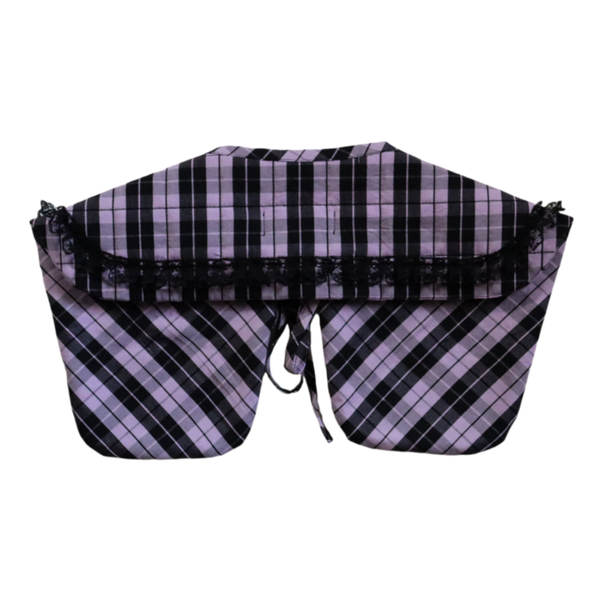 This big collar is a great addition to any outfit. the collar is made of a purple and black checked fabric and is finished with a black lace edge. The tie closure at the front allows you to put it on or take it off whenever and wherever you want. The collars are made from residual materials and are therefore one of a kind