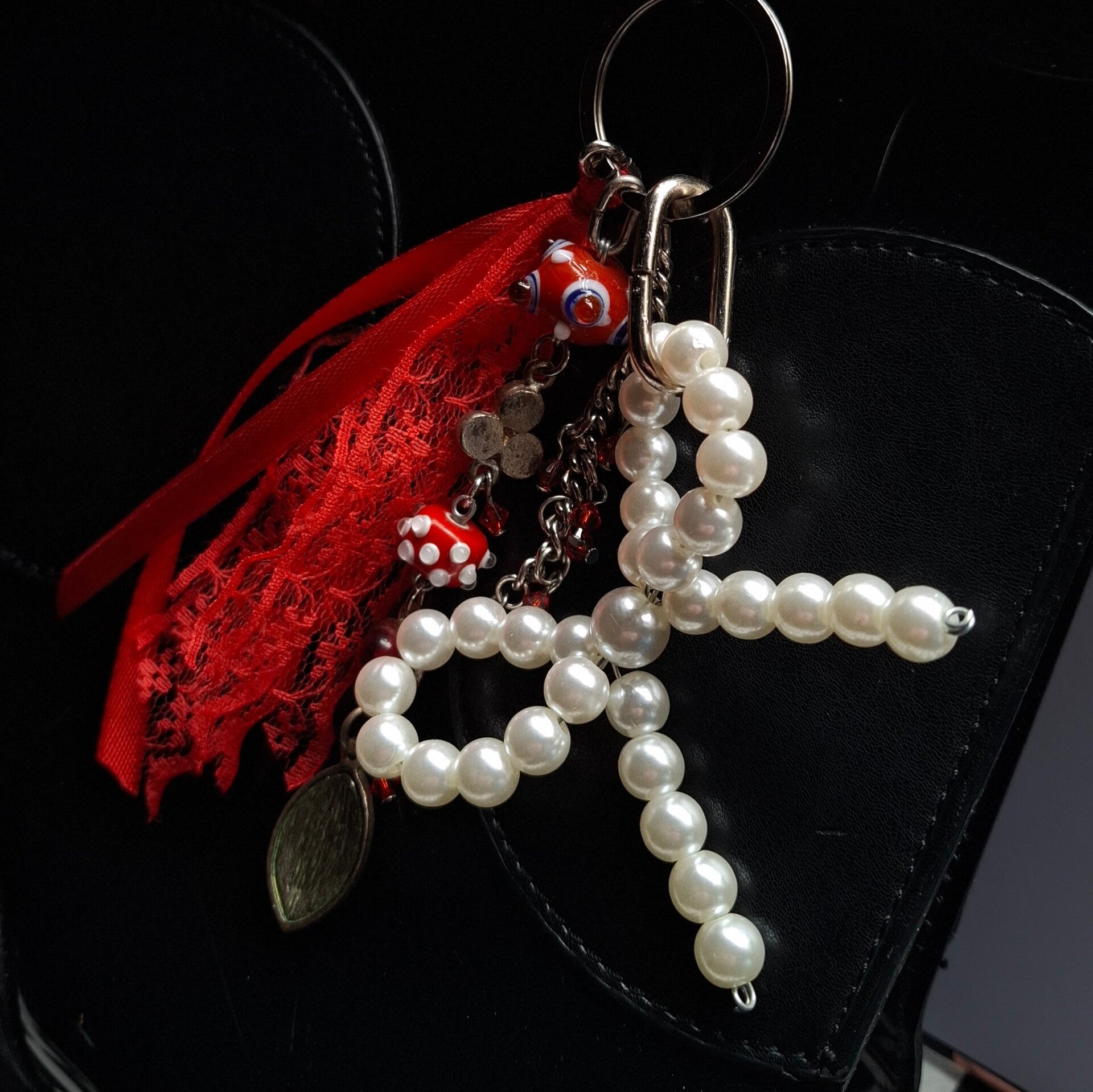 Brighten up your bag or keys with this keychain/ bag charm, made from secondhand beads and materials. Beacuase of this, no two are exactly alike. The metal clip makes it easy to attach to your bag or keys. A super fun, one of a kind addition to your collection!