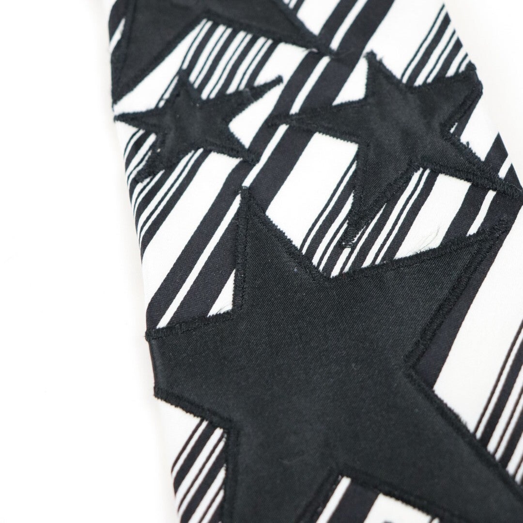 This tie makes every formal (and informal) outfit just a bit more fun. The tie has black and white stripes. The stars are made entirely out of leftover fabrics and are outlined with black stitching.